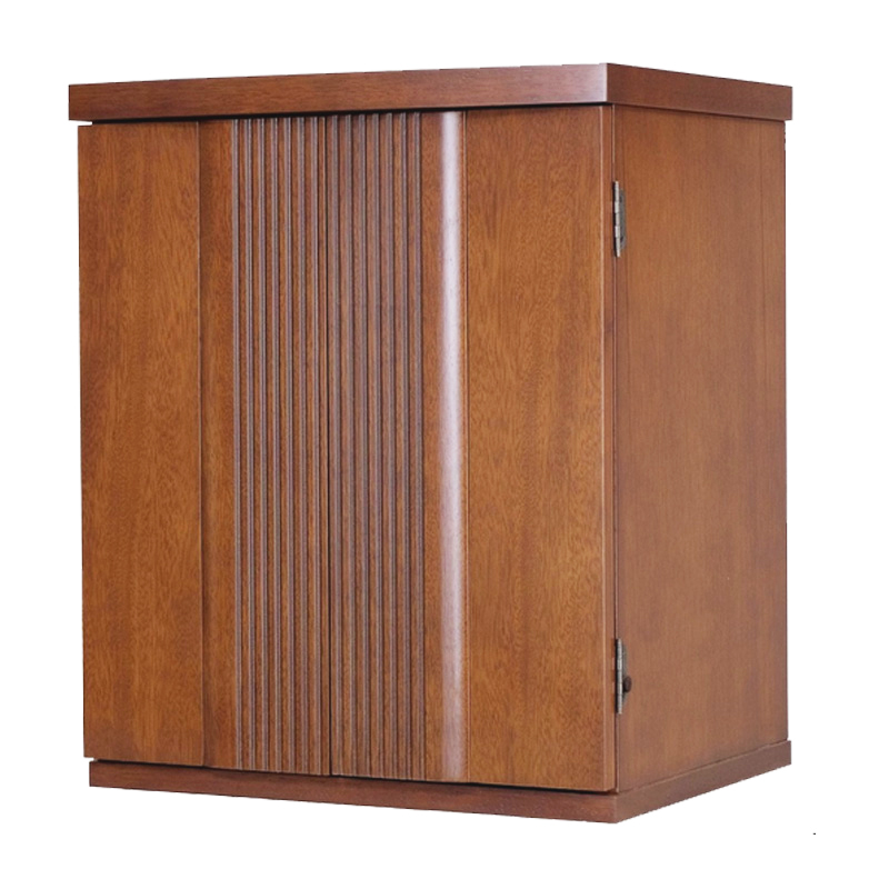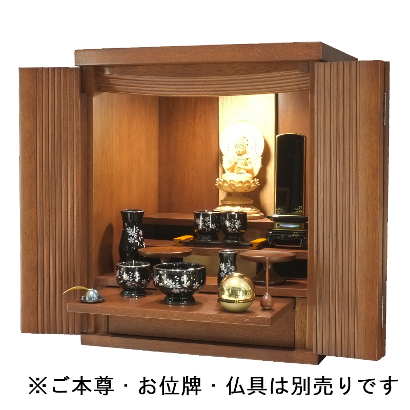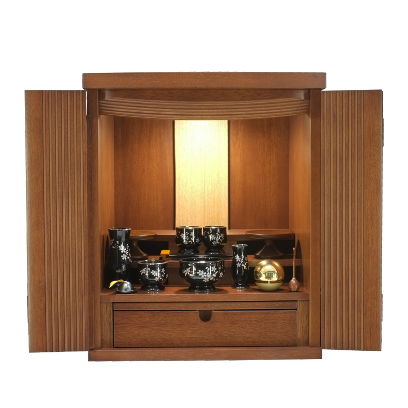 落ち着いた木目を活かした温かみのある佇まいで、和室・洋室を問わず設置しやすく、リビングにも違和感なく馴染みます。内部にはやさしくご本尊を照らす照明を備え、明るく清らかな祈りの空間を演出します。